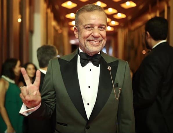 وارتدى الفنان شريف منير بدلة مميزة من اللون الأسود والزيتي مع دبوس مميز بسلسة ذات شكل فاخر.