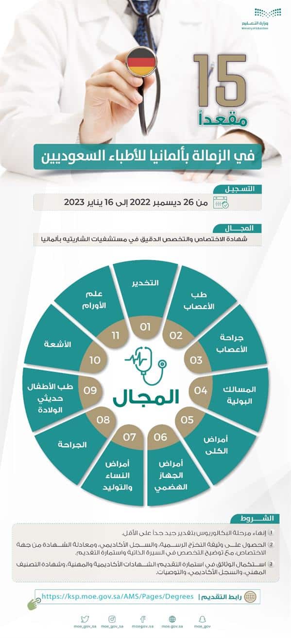 أعلنت وزارة التعليم، تخصيص 15 مقعدًا للتدريب الطبي، في شهادة الاختصاص والتخصص الدقيق في الزمالة للأطباء السعوديين في ألمانيا.