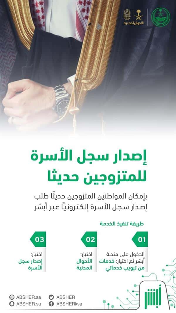 وبيّنت المنصة عبر حسابها الرسمي على «تويتر»، أنه بإمكان المواطنين المتزوجين حديثًا طلب إصدار سجل الأسرة إلكترونياً عبر أبشر.