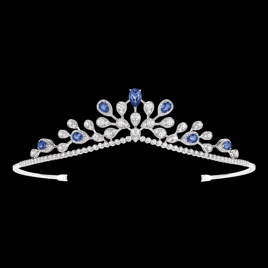 تاج Mélodie Nacrée يعد من التيجان الفخمة كبيرة الحجم التي قدمتها دار شوميه للمجوهرات، وهو مصنوع من الذهب الأبيض ومرصع بماسات براقة بقطع بريانت على شكل أوراق الورود.