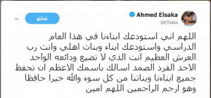 وقال السقا عبر حسابه بموقع التدوينات القصيرة تويتر: “اللهم إنى أستودعك أبنائنا فى هذا العام الدراسى وأستودعك أبناء وبنات أهلى وأنت رب العرش العظيم أنت الذى لا تضيع ودائعه الواحد الأحد الفرد الصمد أسالك باسمك الأعظم أن تحفظ جميع أبنائنا وبناتنا من كل سوء والله خيرًا حافظًا، وهو أرحم الراحمين اللهم أمين”.