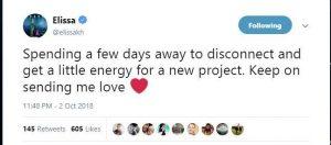 وقالت إليسا عبر تويتر :”سوف أقضي بعض الأيام بعيدًا؛ لتصفية ذهني؛ وللحصول على بعض الطاقة للبدء في مشروع جديد، استمروا في دعمى بمحبتكم”.