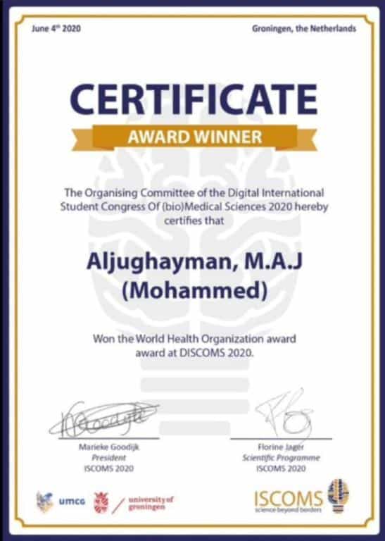 واستطاع الطالب محمد بن عبدالله الجغيمان؛ من كلية الطب أن يحصد جائزة منظمة الصحة العالمية في المؤتمر الطلابي العالمي بهولندا «ISCOMS» والذي تم إقامته عن بعد في 4 يونيو الحالي.