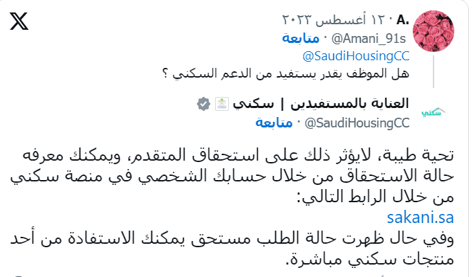 وجاء ذلك ردًا على ما إذا كان العمل الوظيفي يؤثر على استحقاق الدعم السكني. وأفاد البرنامج عن طريق خدمة العناية بالمستفيدين على منصة «تويتر» بأن ذلك لا يؤثر على استحقاق المتقدم.