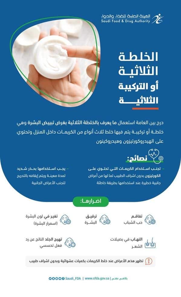 جاء التحذير، بالتزامن مع ما انتشر مؤخرًا بين النساء، بما يعرف بالخلطة الثلاثية لتبييض البشرة، وهي خلطة تتضمن 3 أنواع من الكريمات داخل المنزل، وتحتوي هذه الكريمات على الهيدروكورتيزون وهيدروكينون.