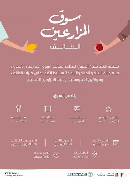 ينطلق سوق المزارعين في الطائف، اليوم السبت، بتنظيم من هيئة فنون الطهي في منتزه الردف، بالتعاون مع وزارة البيئة والمياه والزراعة، لتسليط الضوء على خيرات الطائف وتثقيف الجمهور بالفواكه الموسمية.