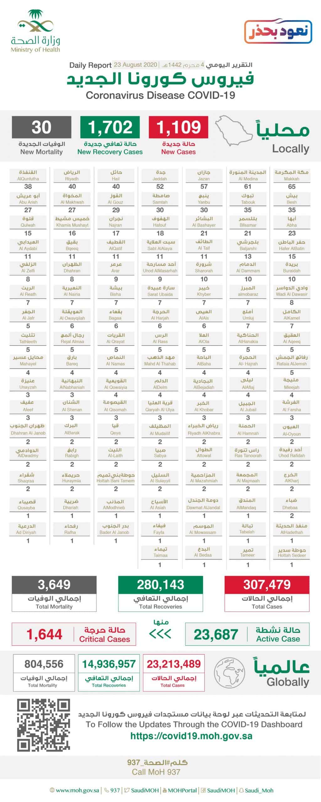 وقالت، في بيانها اليومي: إنه تم تسجيل 1109 حالات إصابة جديدة، فيما بلغت حالات التعافي 1702 حالة، وسجلت الوفيات 30 حالة.