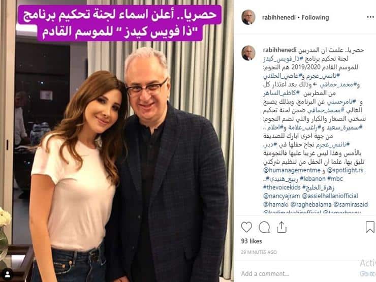 شارك ربيع هنيدي عبر صفحته الخاصة على موقع التواصل الاجتماعي إنستجرام صورة تجمعه مع النجمة اللبنانية نانسي عجرم بجانبها علق بأسماء المدربين الجدد.