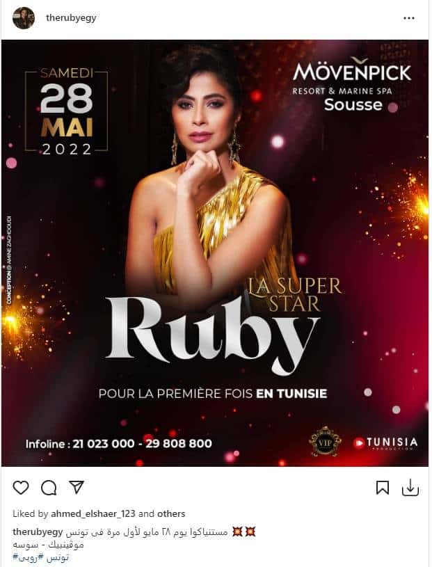 وتتشوق «روبي» لملاقاة جمهورها في تونس الحبيبة؛ حيث روجت للحفل من خلال نشر بوستر الحفل الرسمي عبر حسابها الرسمي على موقع التواصل الاجتماعي «انستجرام».