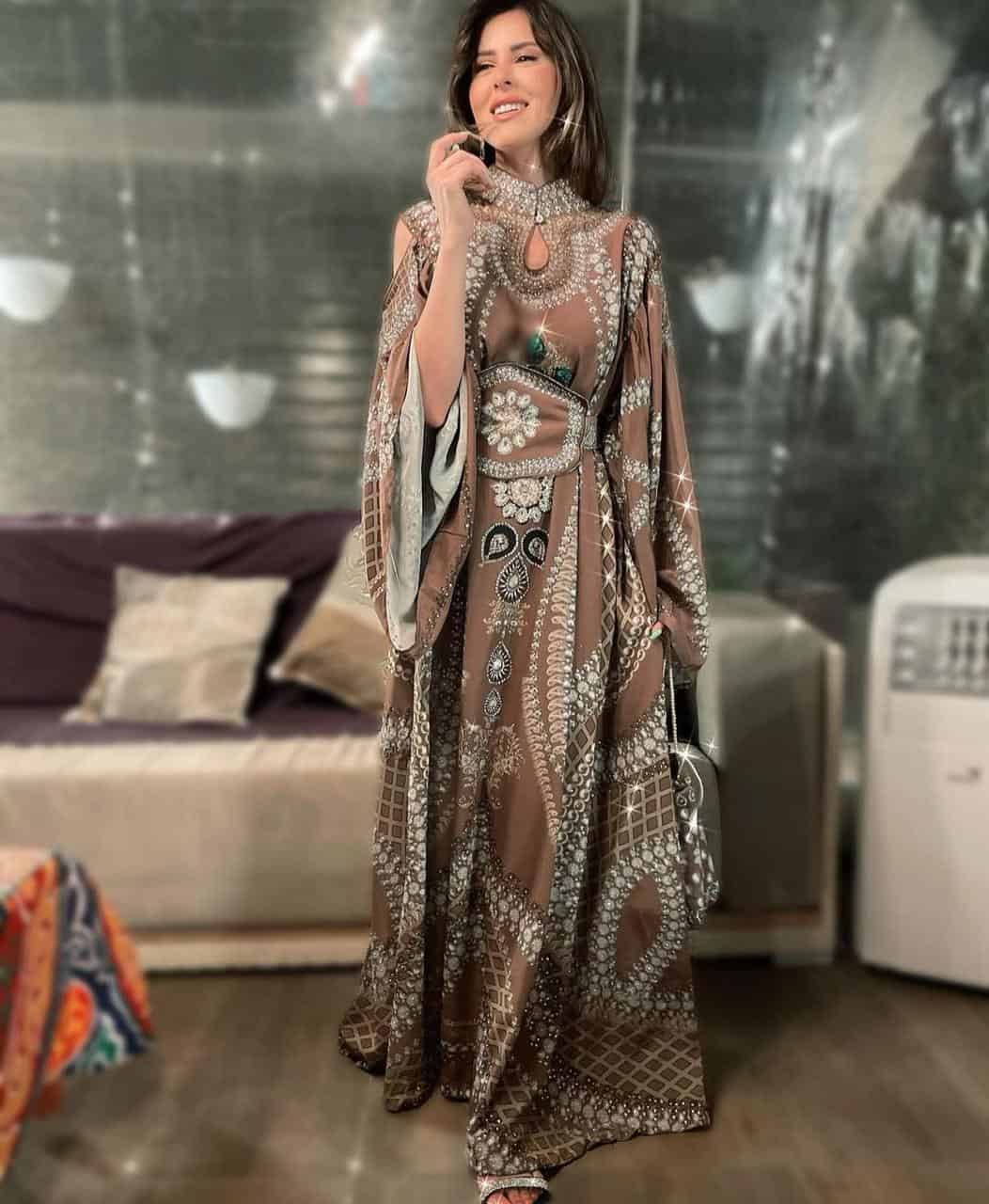 تألقت المذيعة والممثلة البحرينية نور الشيخ، بجلابية باللون البني مطرزة بفصوص سوداء وفضية مع أكمام عصرية واسعة، وتسريحة شعر منسدلة مع مكياج بني.