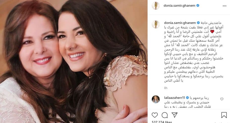 ونشرت «دنيا»، عبر حسابها الرسمي على موقع التواصل الاجتماعي “إنستجرام”، صورة تجمعها بوالدتها، معلقة «ماعنديش حاجة أقولها غير إني فعلًا بقيت يتيمة من غيرك يا أمي».