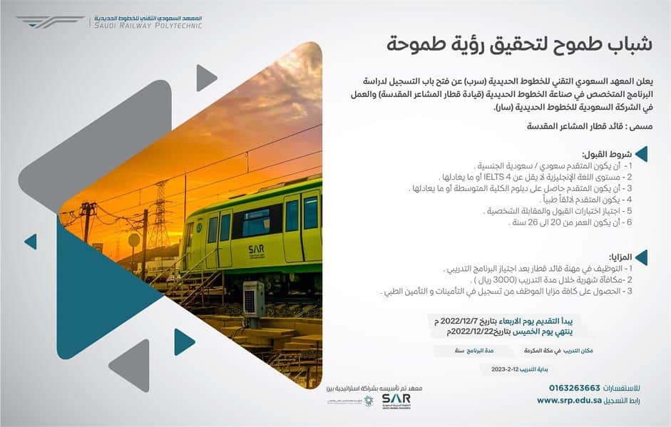 أعلن المعهد السعودي التقني للخطوط الحديدية (سرب) عن فتح باب التسجيل لدراسة البرنامج المتخصص في صناعة الخطوط الحديدية “قيادة قطار المشاعر المقدسة” والعمل في الشركة السعودية للخطوط الحديدية – سار.