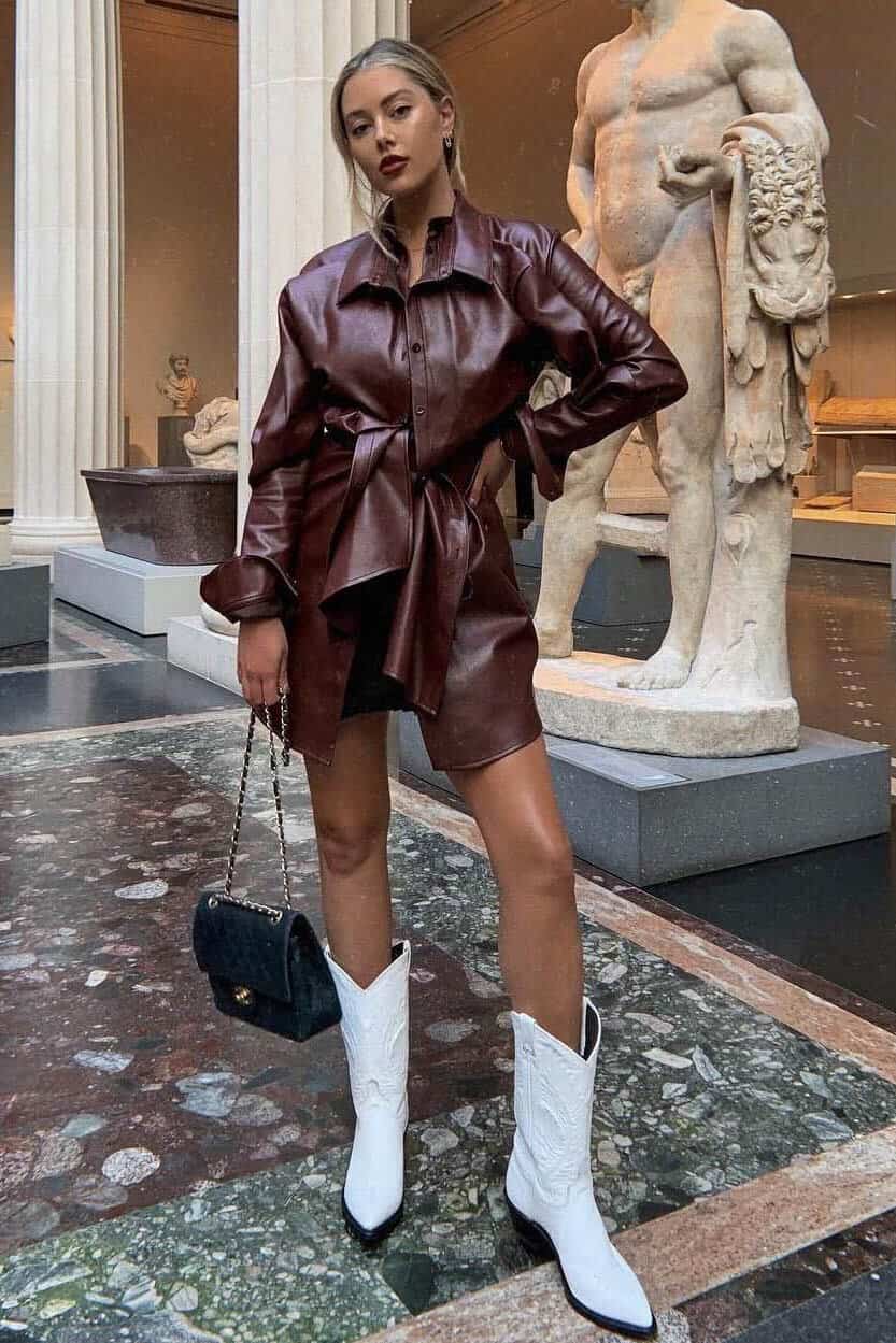 ولإطلالة أكثر جرأة، يمكنكِ ارتداء الجاكت الجلد البني الطويل، مع حذاء الكاوبوي باللون الأبيض، ويمكنكِ ارتداء تنورة قصيرة من الجينز أو القماش أسفل الجاكيت مع بلوزة سوداء ناعمة.