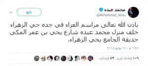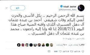 وكتب محمد عبده، عبر حسابه الرسمى على موقع التدوينات القصيرة تويتر، قائلا: “بسم الله الرحمن الرحيم.. بكل الأسى والحزن أنعى إليكم وفات شقيقى أحمد بن عبده عثمان آل دهل العسيرى الذى وافته المنية صباح هذا اليوم 2018/7/11 إنا لله وإنا إليه راجعون. محمد بن عبده عثمان آل دهل العسيرى“.