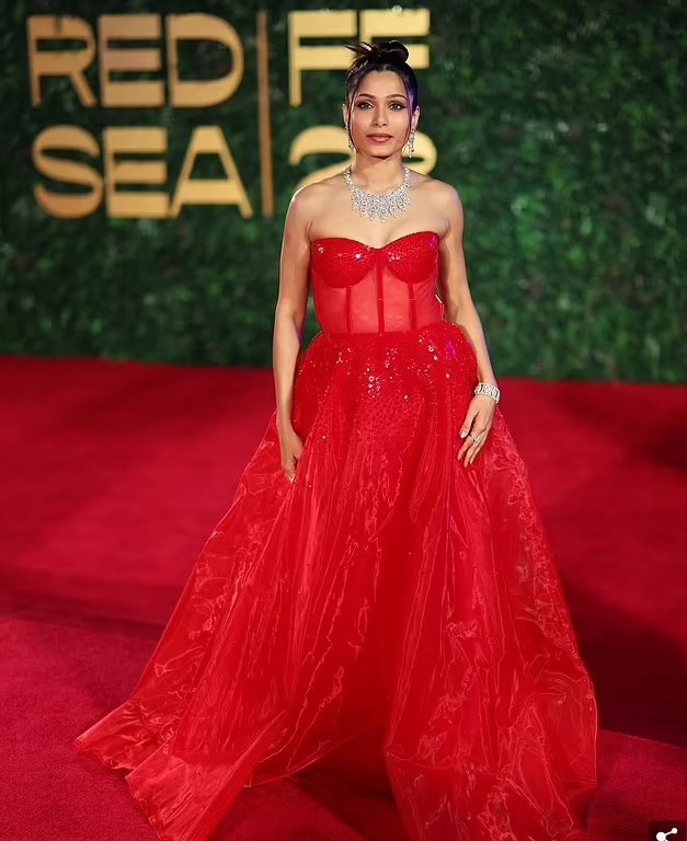 وأطلت النجمة فريدا بنتو Frida Pinto بفستان أحمر يتألف من كورسيه من التول القاسي الشفاف، مع تنورة لامعة حمراء مشكوكة بالكامل بالباييت الأحمر البراق. كما تتسم بتنورة منفوخة بقصة أميرية. وتميزت بمجوهرات ماسية وبتسريحة شينيون راقية مع مكياج سموكي على العيون.