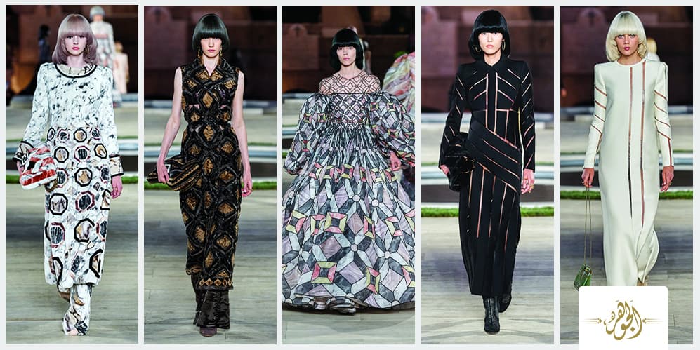 وتم افتتاح عرض الأزياء، مؤخرًا، ببدلة من الصوف الأبيض اللامع مع جاكيت كامل الأكمام وبنطلون بأرجل واسعة، لتذكرنا بموضة السبعينيات؛ حيث تميزت هذه الفترة بمعاطف ماكسي مع شرائط من الفرو في اتجاهات مختلفة أو مقطوعة لإنشاء أنماط “ديكو”، ويعد هذا أحد اختراعات “لاغرفيلد”.