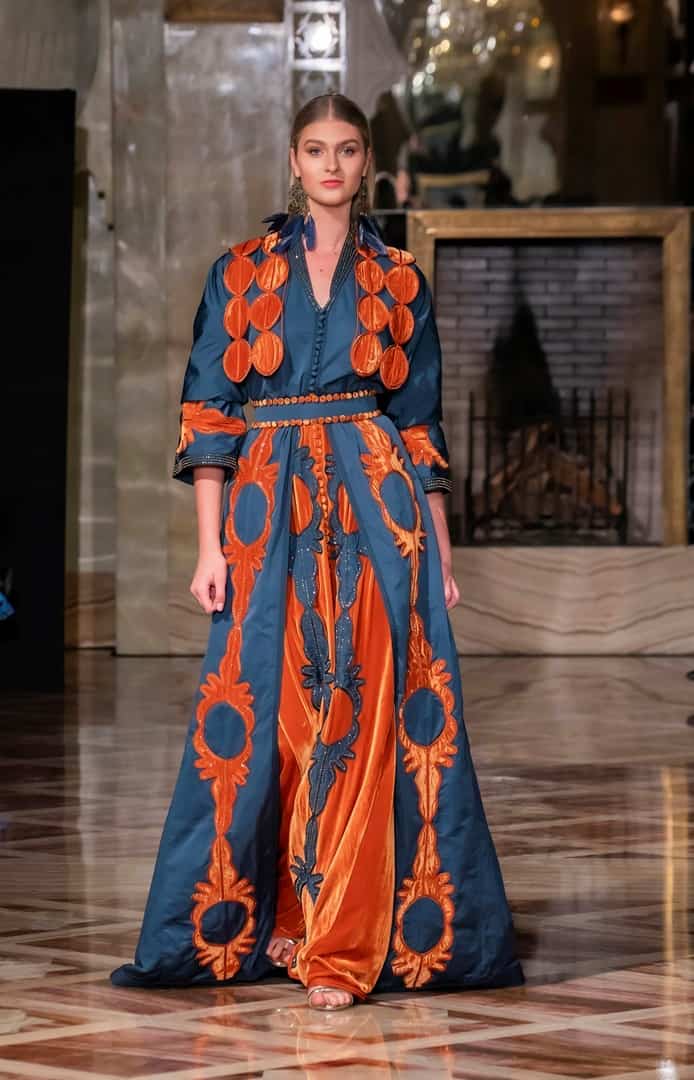 وهو مصنوع من قماش الاورجانزا الفاخر، كما جاء القفطان باللون الكحلي المزين بقصات من القماش نفسه.