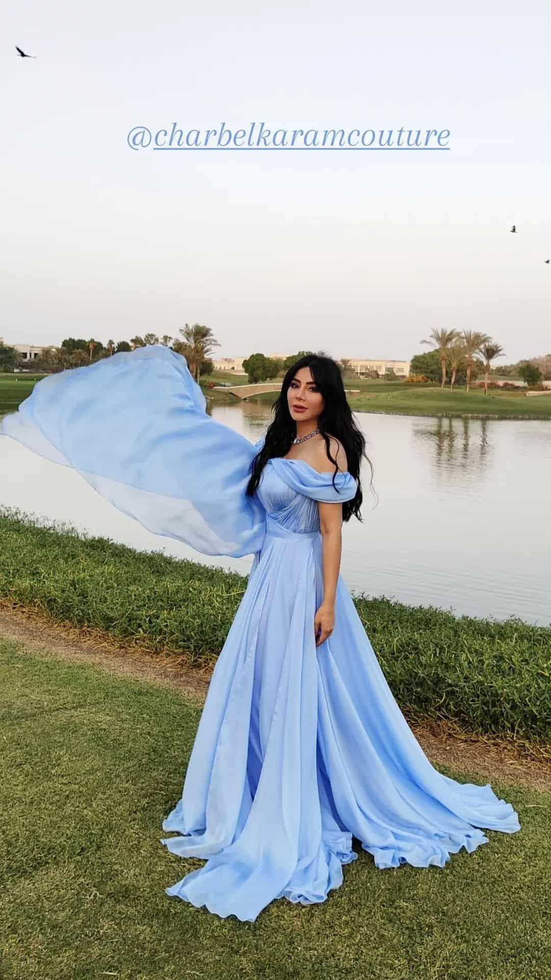 واختارت عمران لهذه المناسبة فستانًا باللون الأزرق الفاتح من تصميم اللبناني شربل كرم، بدا بدون أكمام ومع ذيل طويل، وتركت عمران شعرها منسدلًا، واختارت مكياجًا ناعمًا، ناسب إطلالتها وعقدها الماسي.