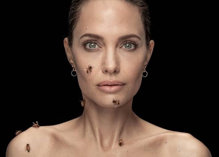 ونشر موقع ناشيونال جيوجرافيك صورة للممثلة الأمريكية أنجلينا جولي وهي تحدق مباشرة في الكاميرا، في حين يزحف النحل على جسدها.