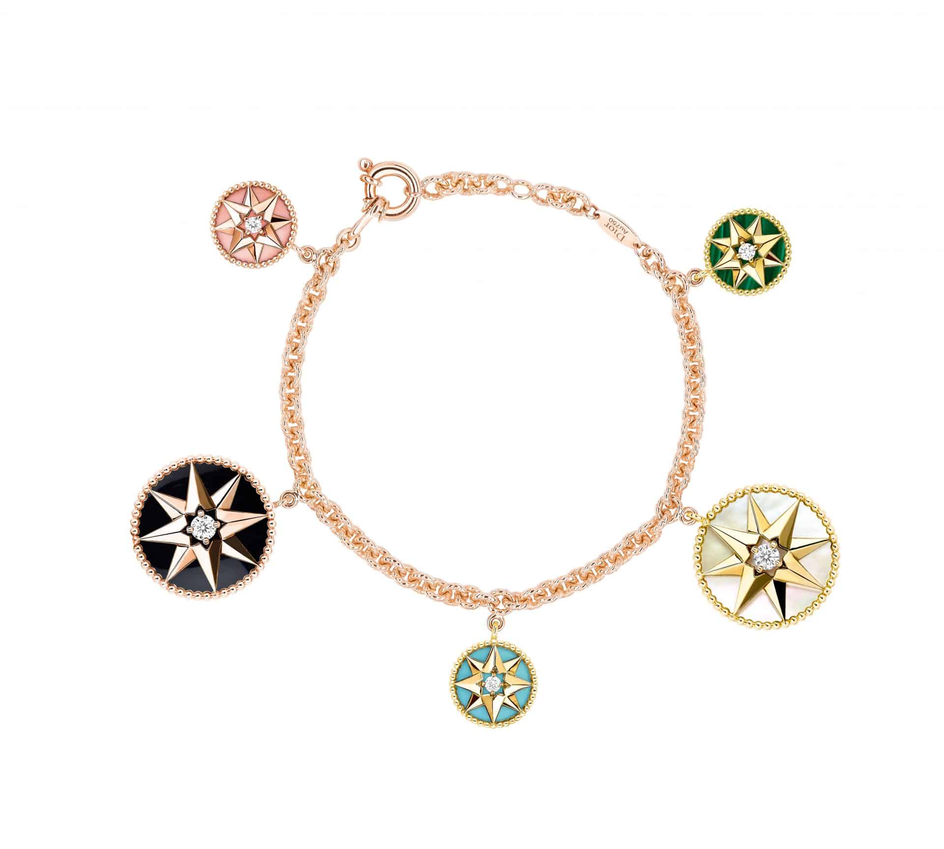 عندما ترغبين في ارتداء أسورة مختلفة تجذب الأنظار إليك، فيجب أن تعتمدي هذا السوار من مجموعة Rose Des Vents العصرية، فهو مصمم من الذهب الوردي الأنيق الذي يتحلى بالأحجار الكريمة المختلفة مع رسومات النجوم الذهبية؛ إذ يمكنك تنسيقه بشكل متألق في مناسبتك بشكل جيد كي تظهرين بشكل أكثر جاذبية.