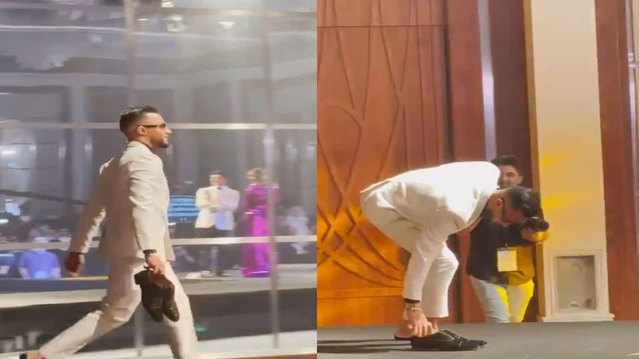 وظهر في الفيديو وهو يخلع الحذاء قبل الصعود على مسرح التكريم، واستكمل مشواره حافيًا بالجوارب.