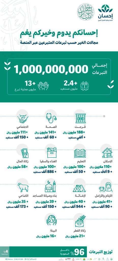 كشفت منصة إحسان للعمل الخيري، عن أوجه إنفاق المليار ريال من التبرعات التي تم جمعها من 13 مليون عملية تبرع.