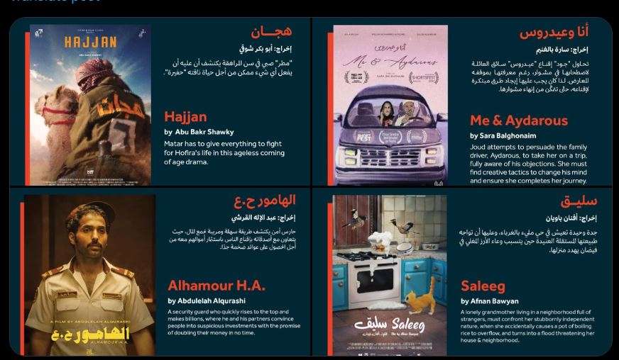 وكشفت خلال صفحتها الرسمية على موقع التدوينات القصيرة “إكس” عن مشاركة أربعة أفلام سعودية من خلال إنفوجراف تتضمن أسماء الأفلام المشاركة.