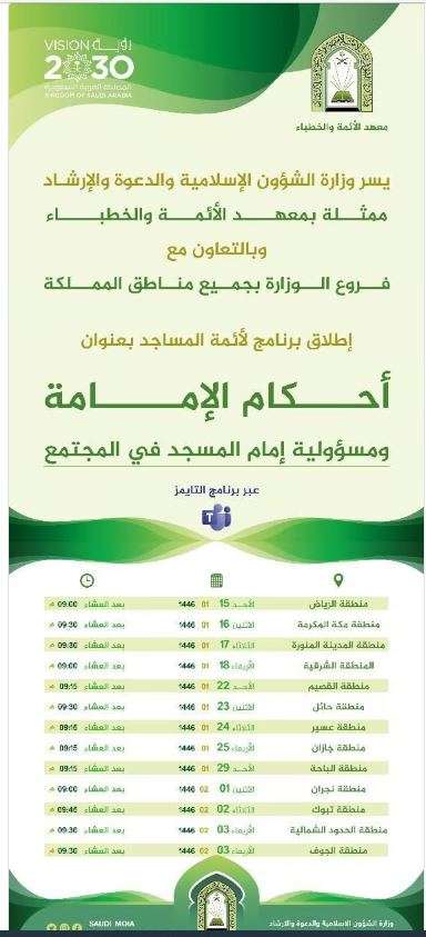 تطلق وزارة الشؤون الإسلامية والدعوة والإرشاد، ممثلة بمعهد الأئمة والخطباء، برنامج (أحكام الإمامة ومسؤولية إمام المسجد في المجتمع)، وذلك “عن بعد” عبر برنامج “التايمز”.