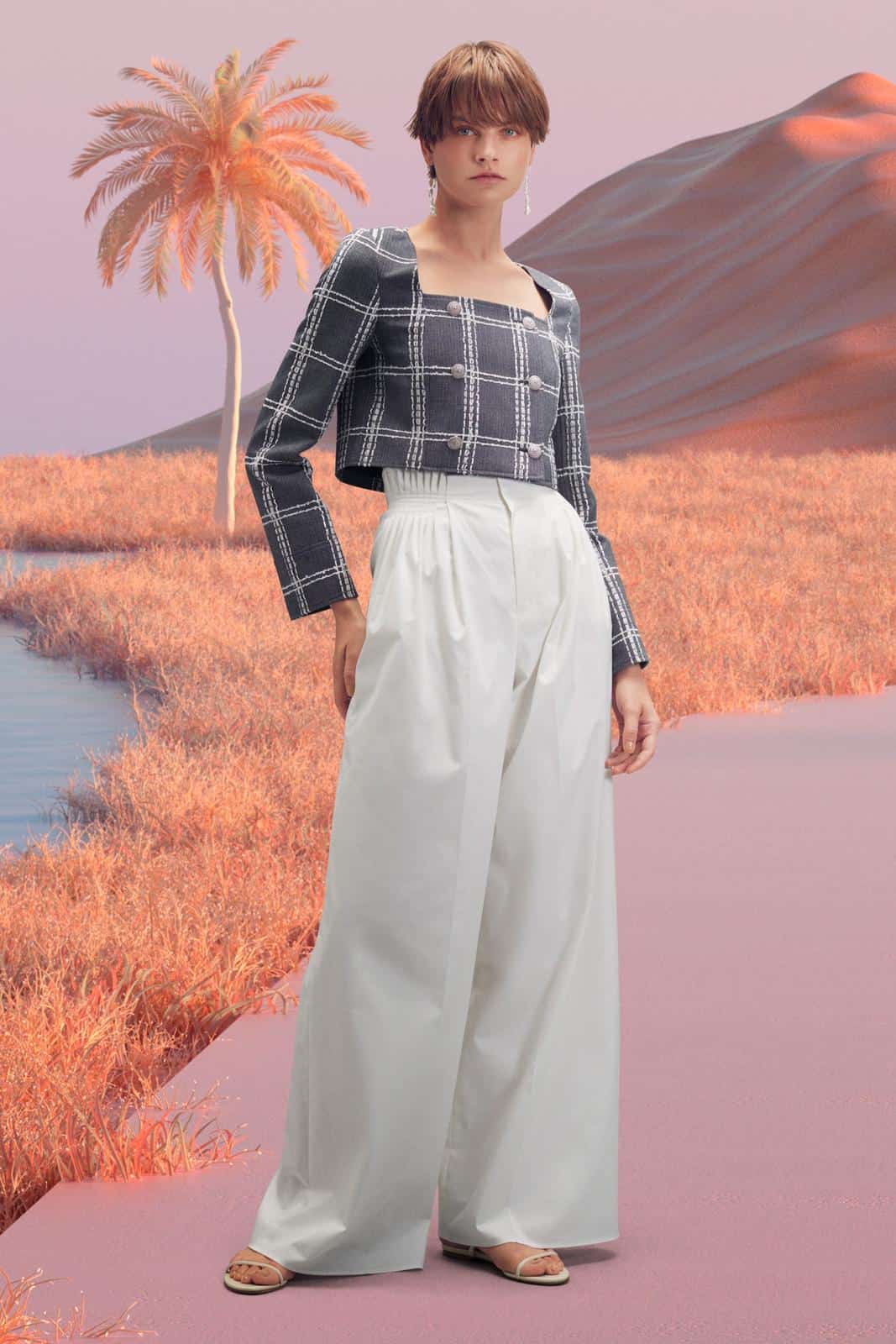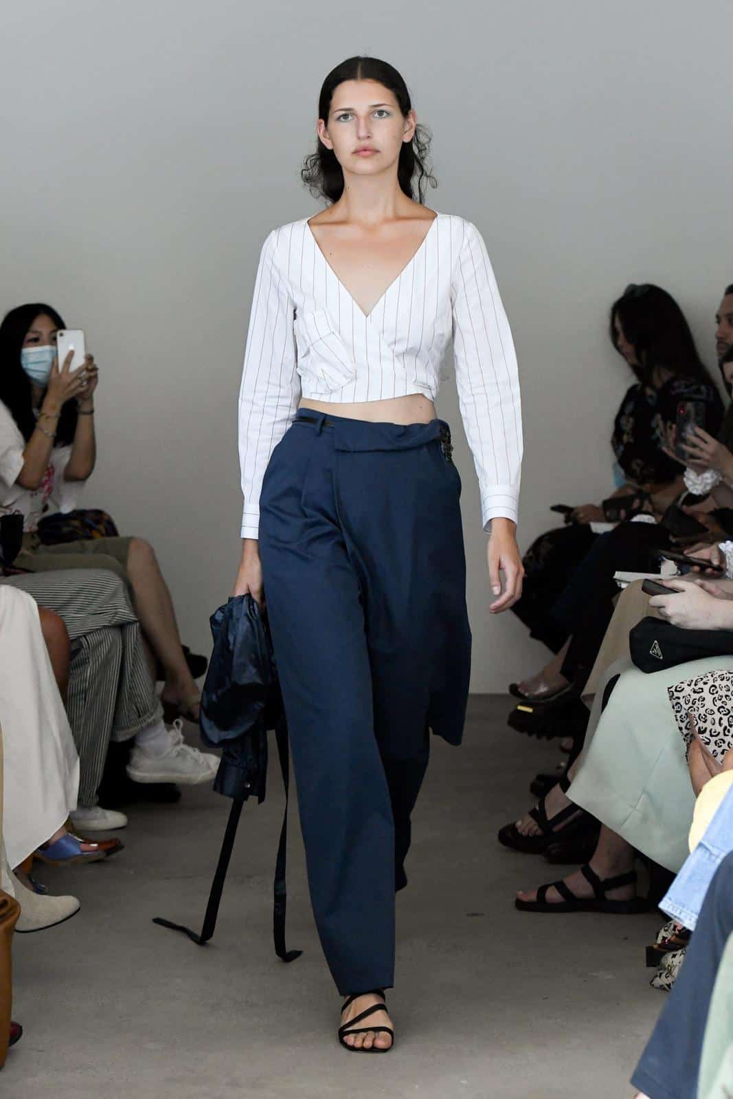 على سبيل المثال، شاهدنا بلوزة Wrap قصيرة مشجرة من تصميم ماركة آدم Adeam، والتي تم تنسيقها مع بنطال نعناع بقصة رجالية.