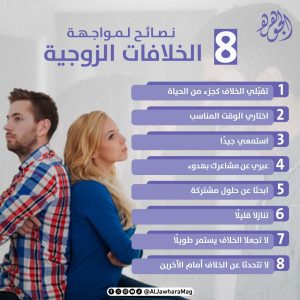 الخلافات الزوجية أمر طبيعي وصحي في أي علاقة، ولكن الأهم هو كيفية التعامل معها بشكل صحيح وبناء. إليكِ بعض النصائح التي تساعدكِ في مواجهة الخلافات الزوجية: